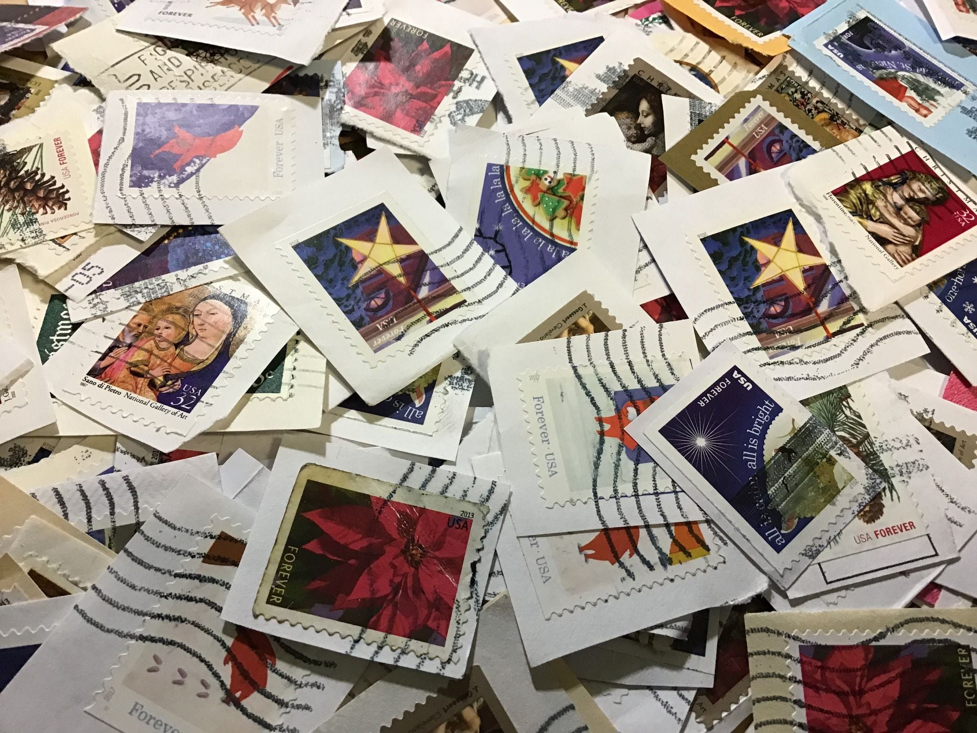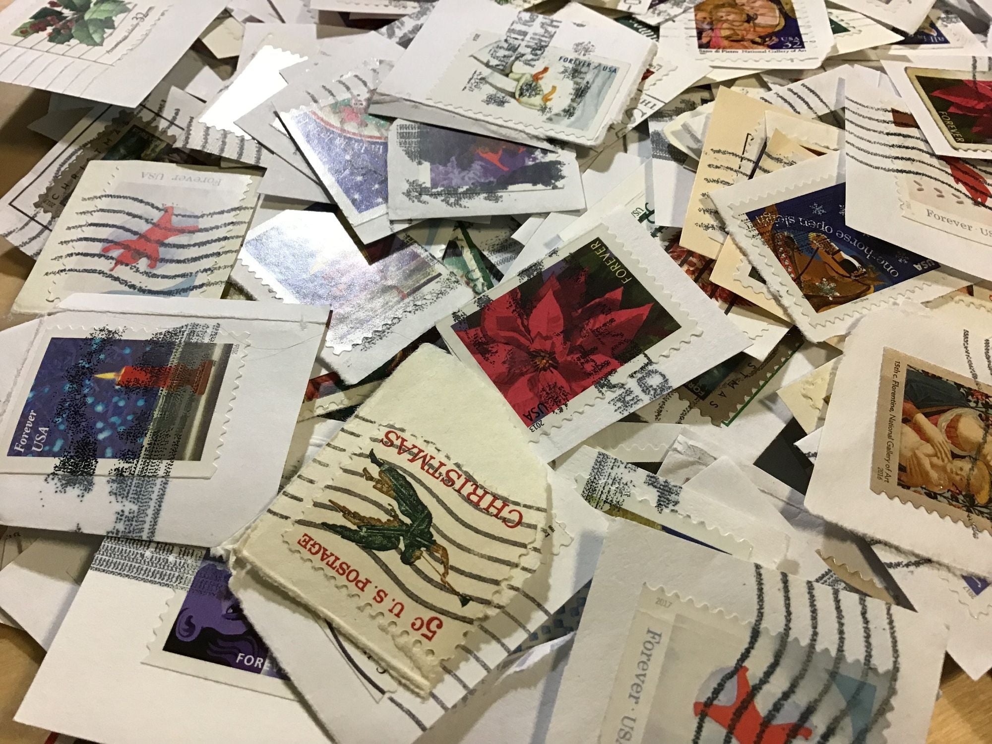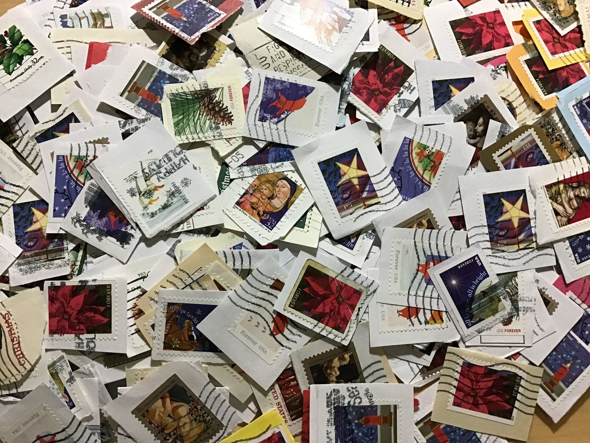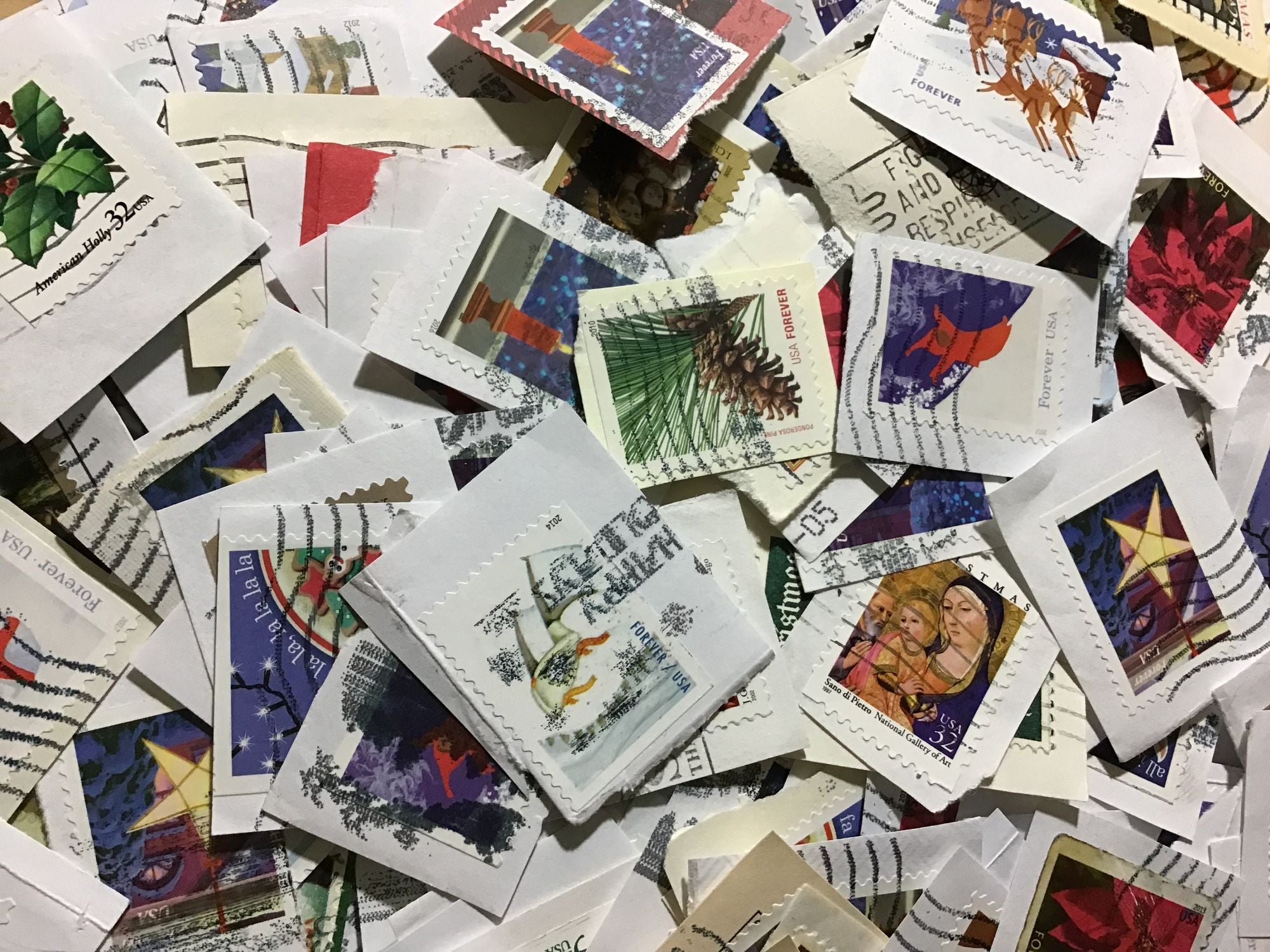 500 used Christmas Stamps (pictured). These are on paper (which means there is backing on the stamps or envelope pieces).
