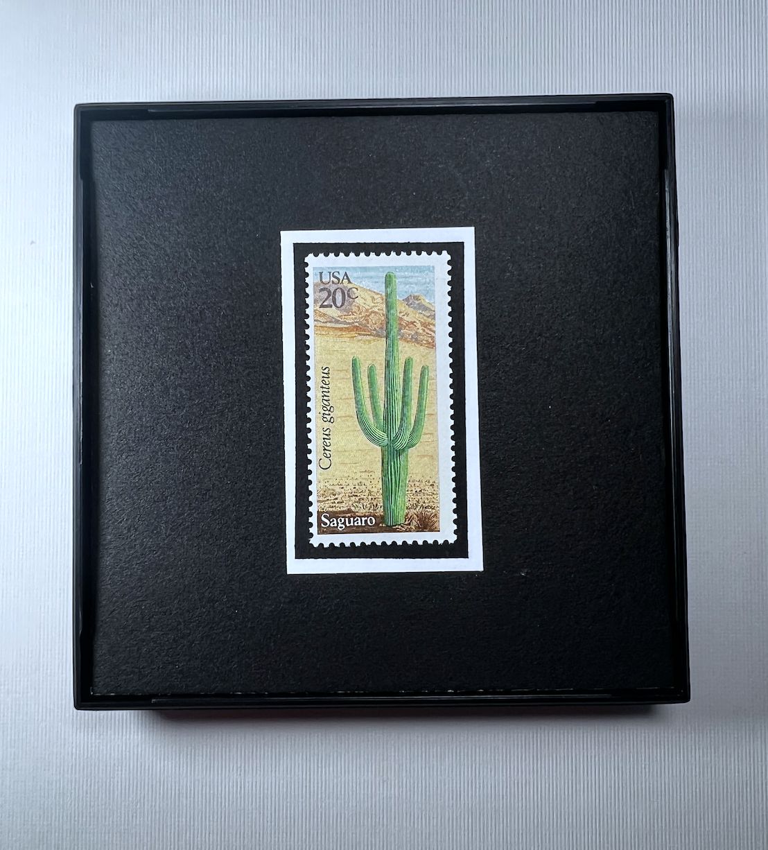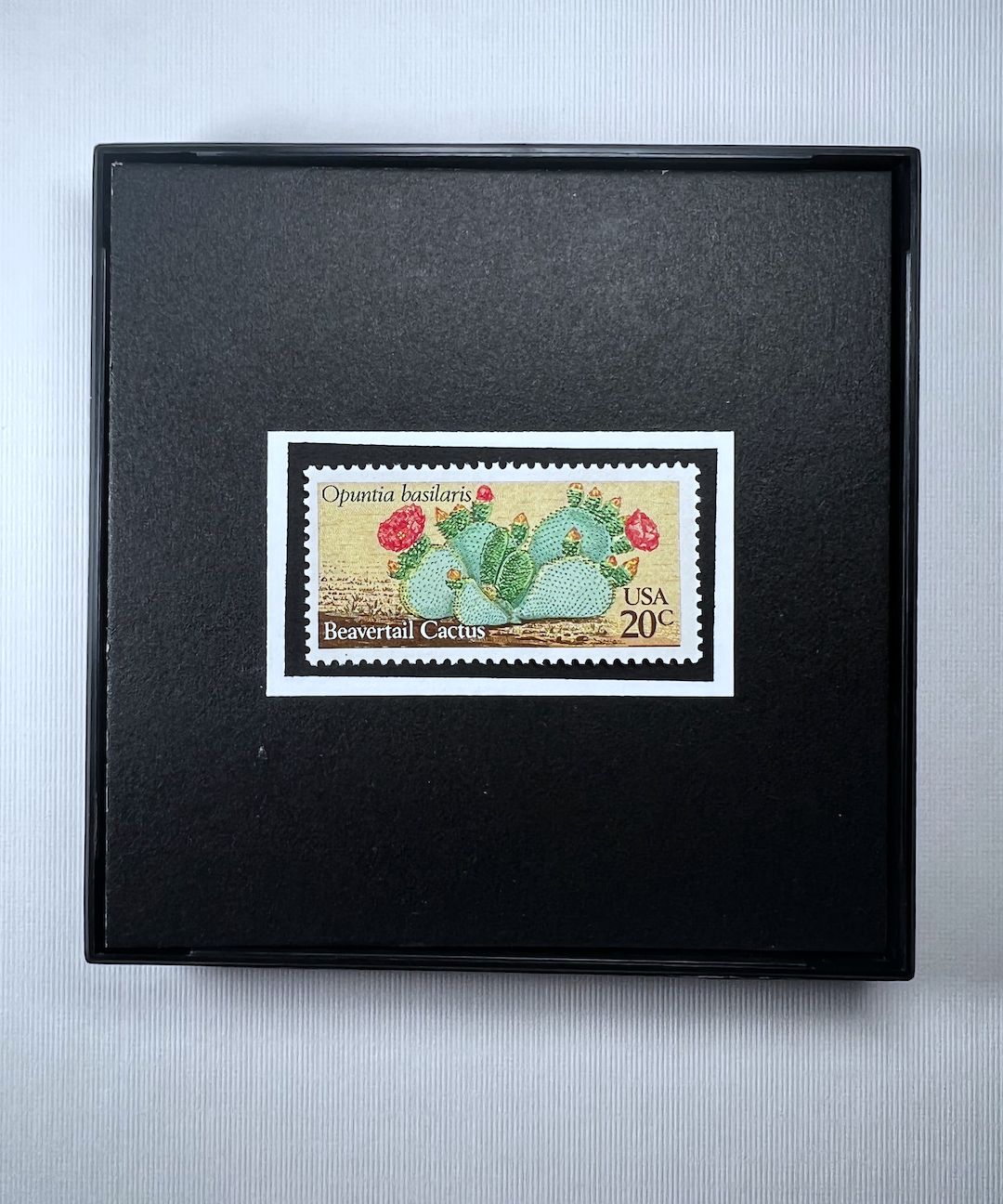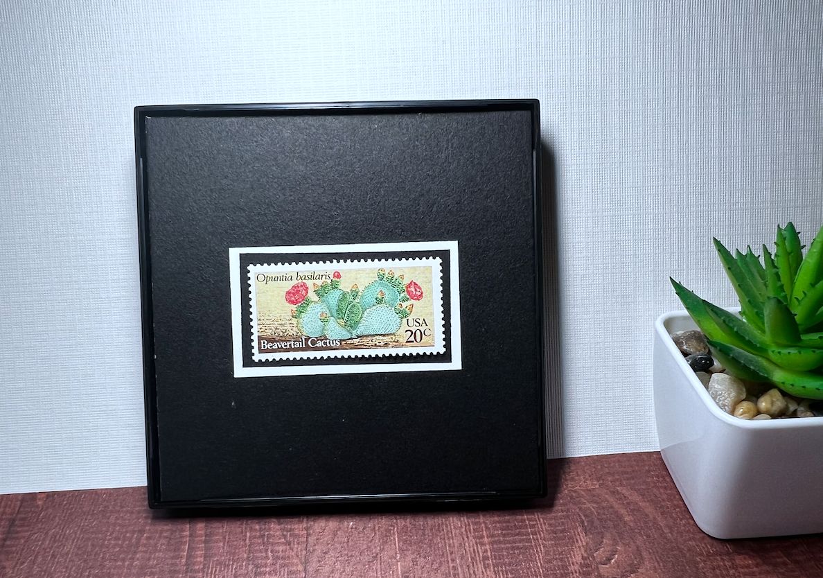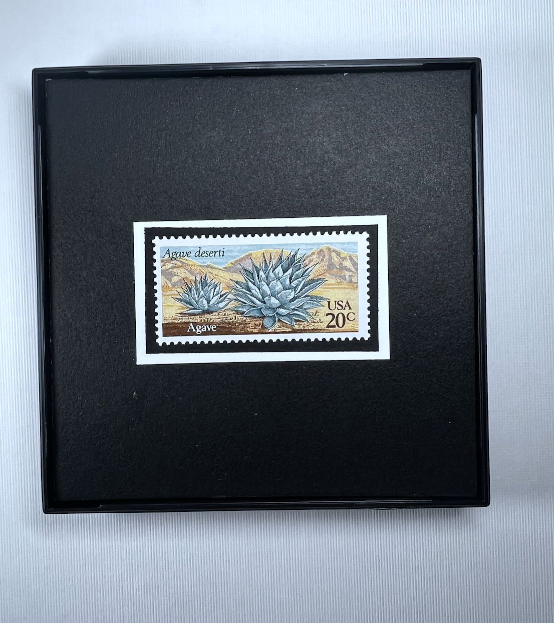 SIZE: 4”x 4” x 1/2” Square Frame with New/Unused postage stamps from the United States and glass front.