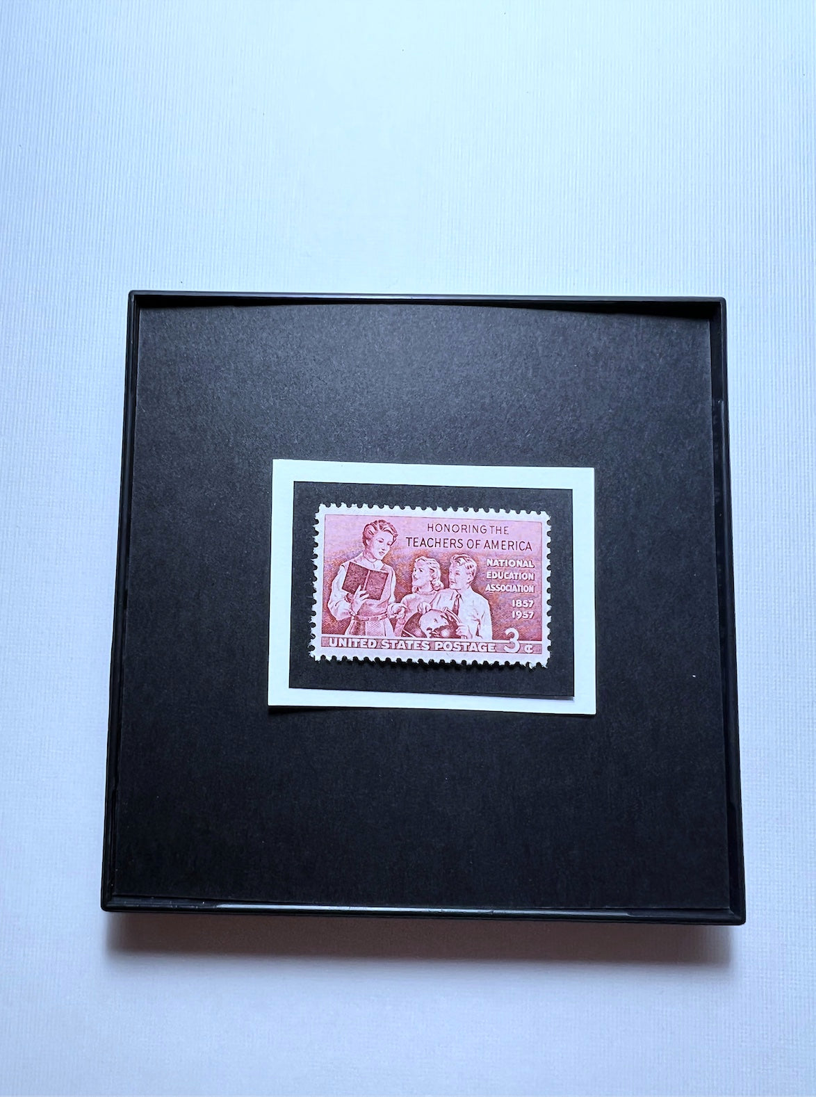 SIZE: 4”x 4” Glass Topped Square Frame with New/Unused postage stamps from the United States.