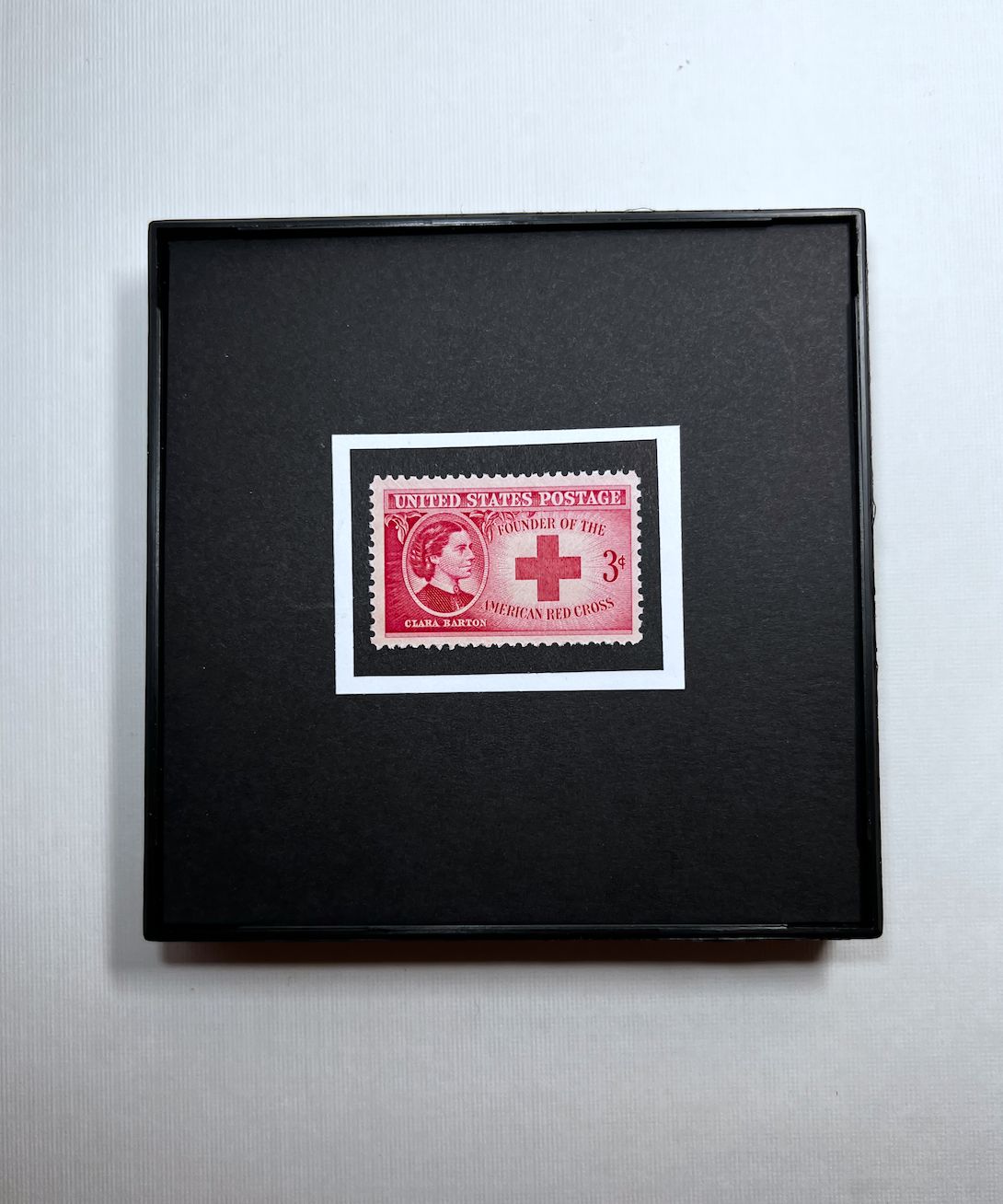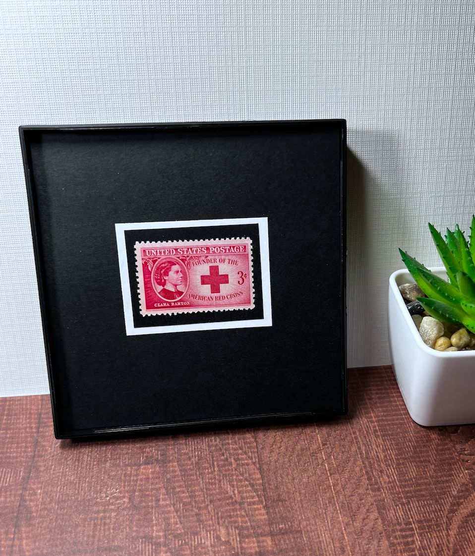 SIZE: 4”x 4” x 1/2” Square Frame with New/Unused postage stamps from the United States and glass front.
