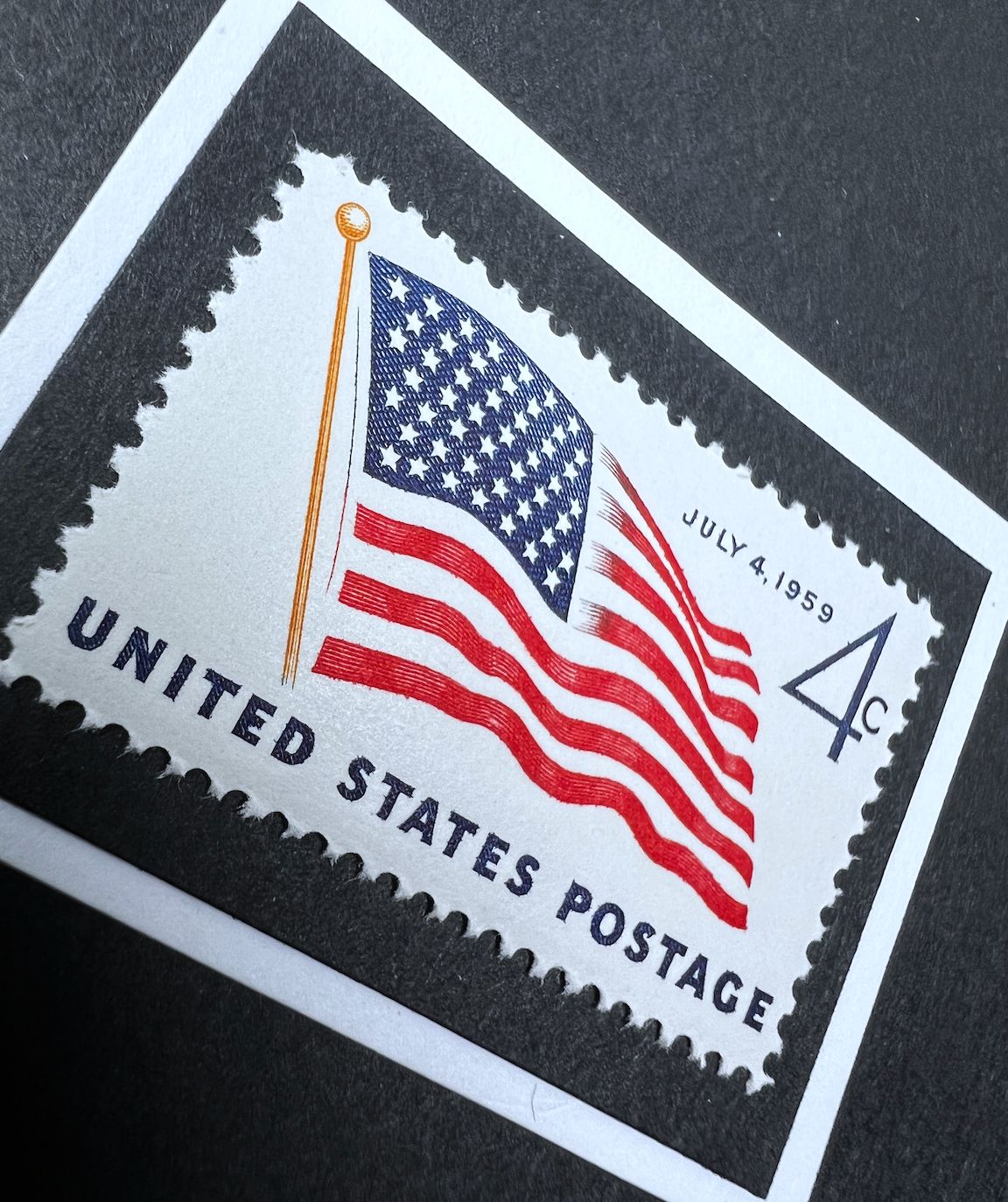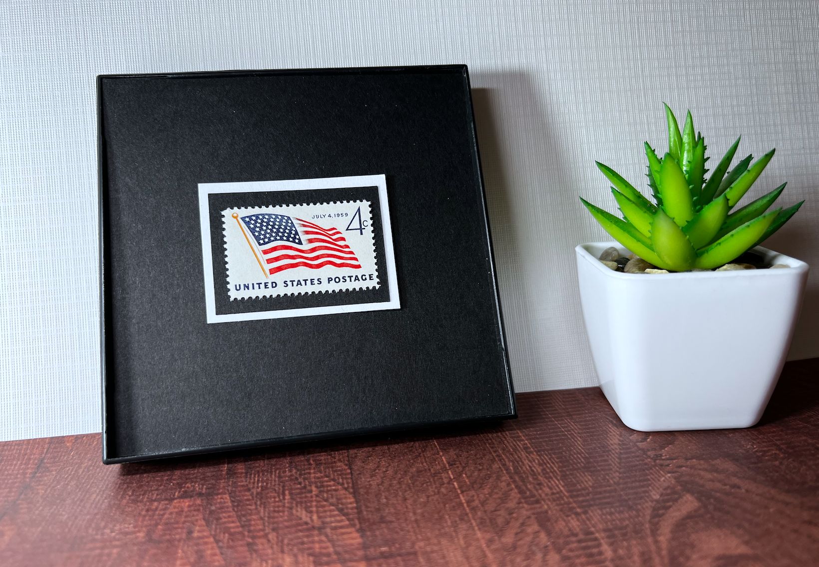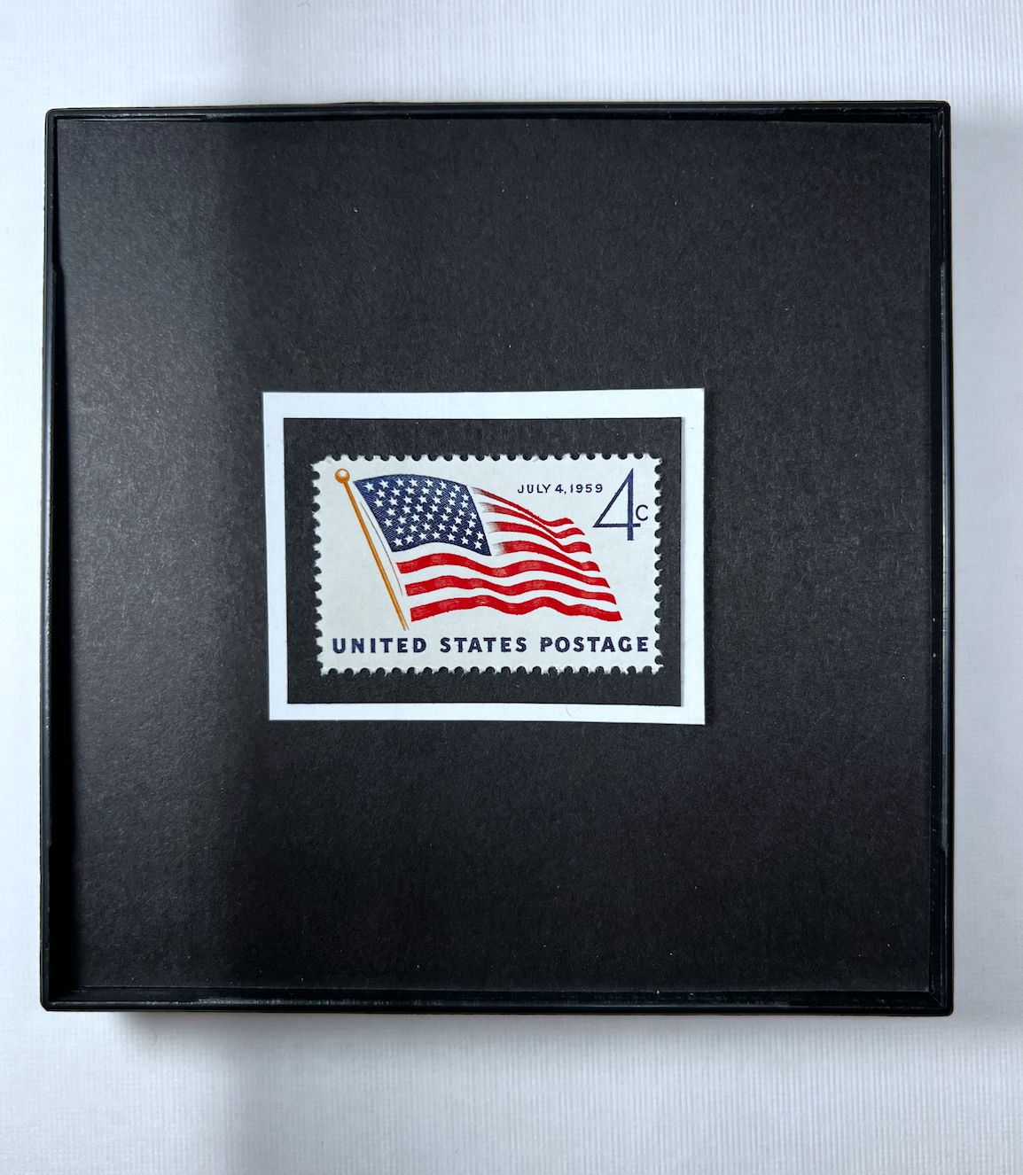 SIZE: 4”x 4” x 1/2” Square Frame with New/Unused postage stamps from the United States and glass front.