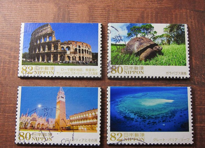Set of magnets made using recycled postage stamps that have traveled around the world.